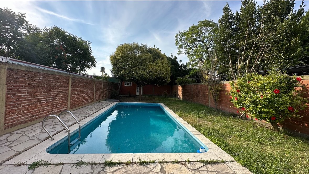 En el patio trasero se encuentra una piscina, parrilla exterior y un depósito para herramientas.
