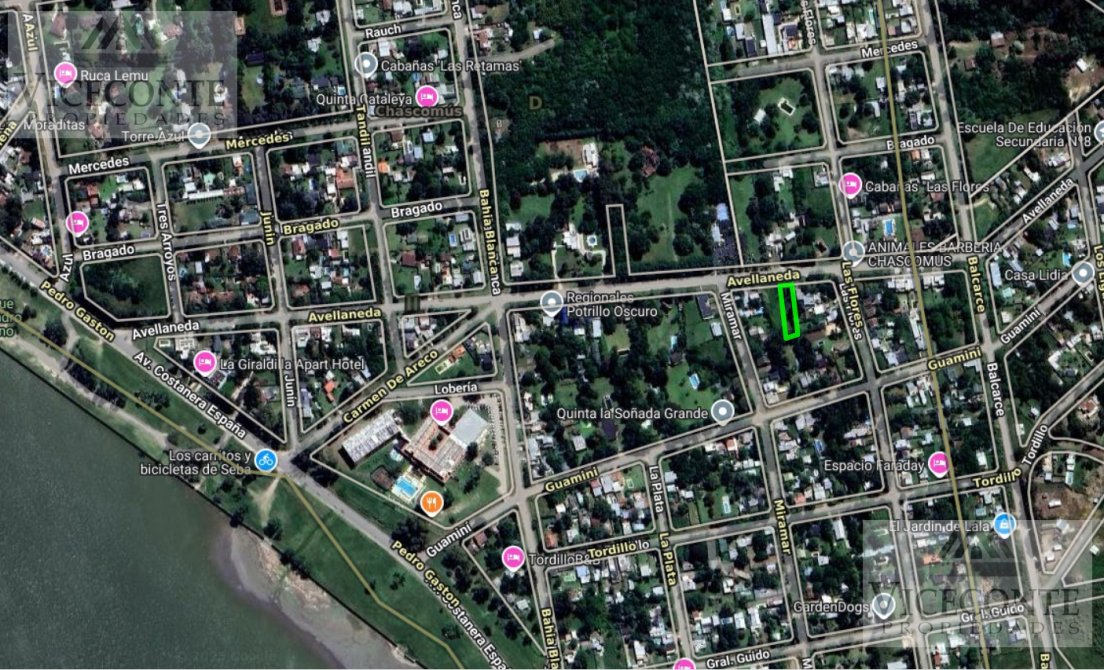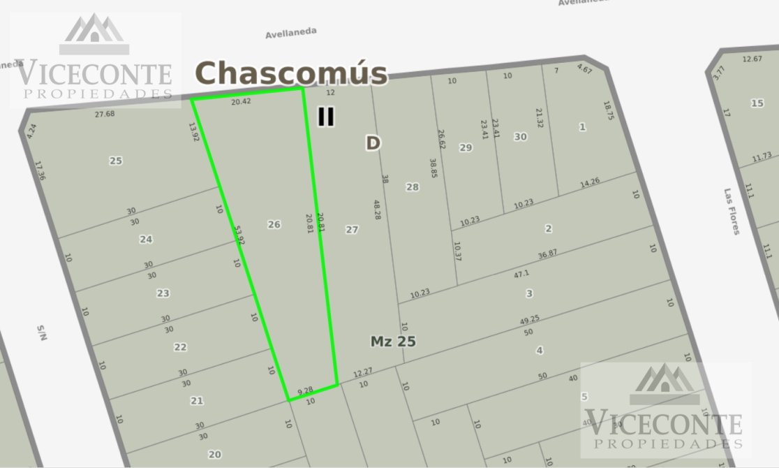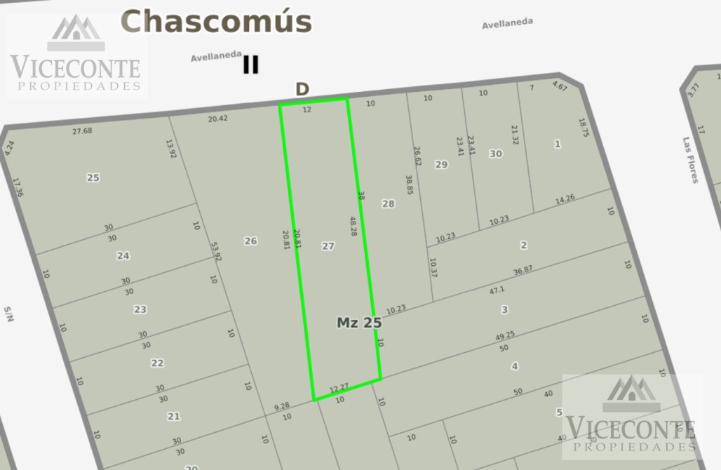 Inmueble ubicado en calle Calle Avellaneda entre Las Flores y Miramar de la ciudad y partido de Chascomús, provincia de Buenos Aires. Esta constituida por dos parcelas de terreno referenciadas en 26 y 27 las que en caso de venderse juntas forman una superficie total de terreno de 1363m2.