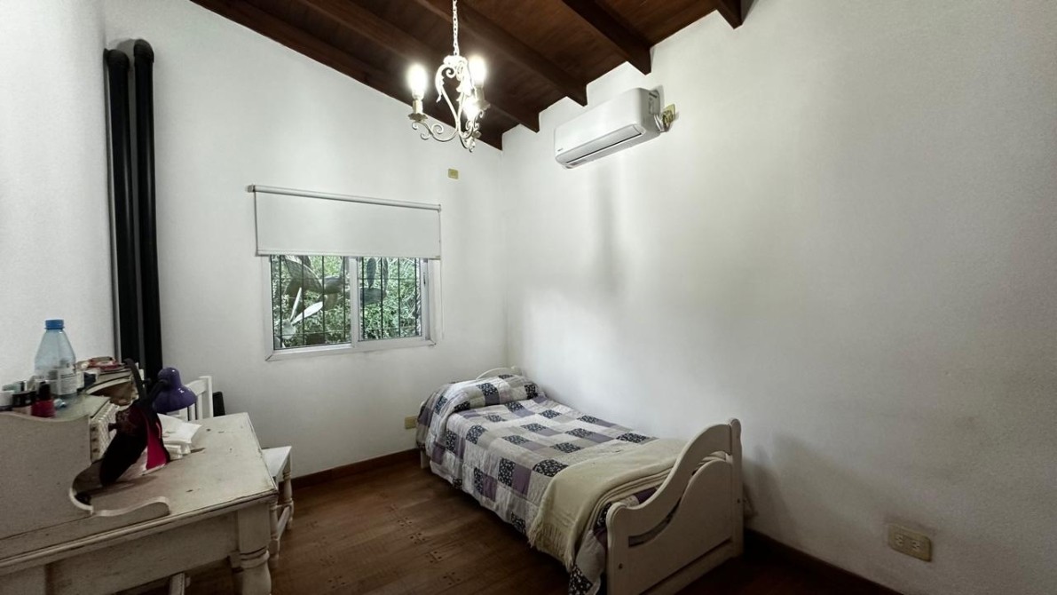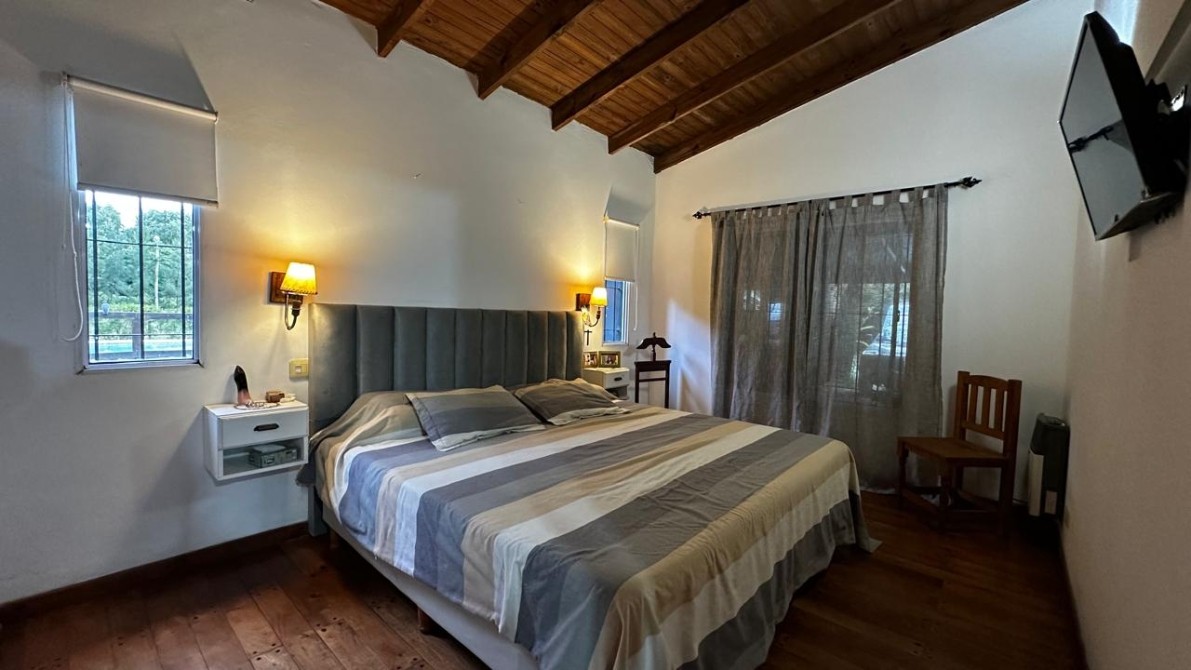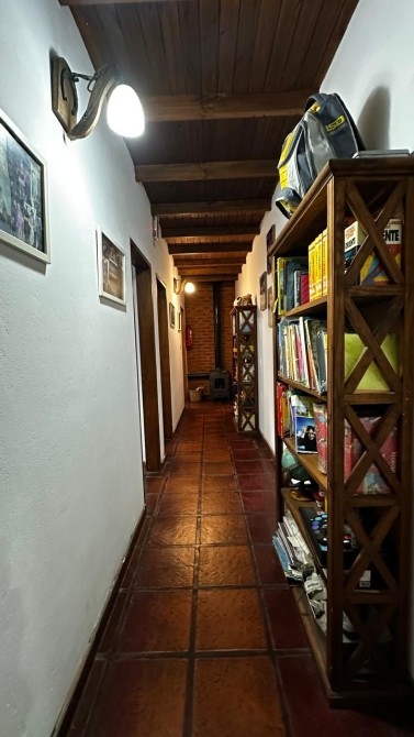 - Pisos de mosaicos, madera tarugadas en habitación, cielorraso de madera con tirante a la vista.
