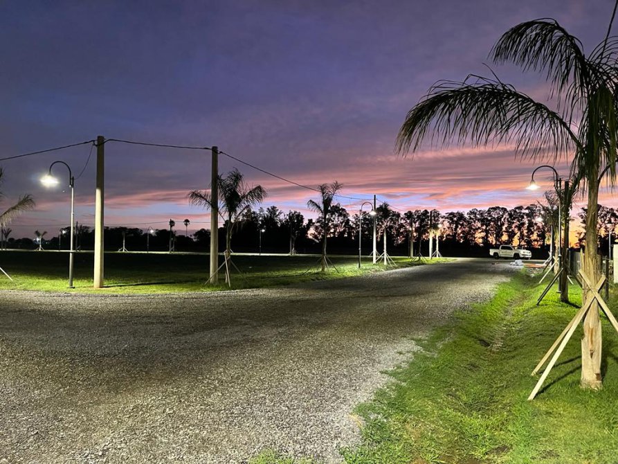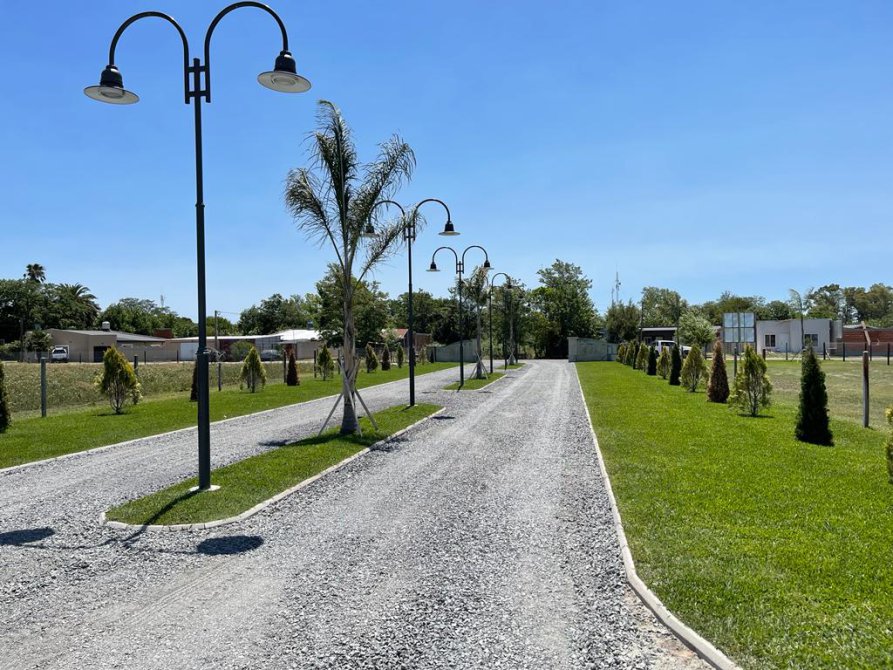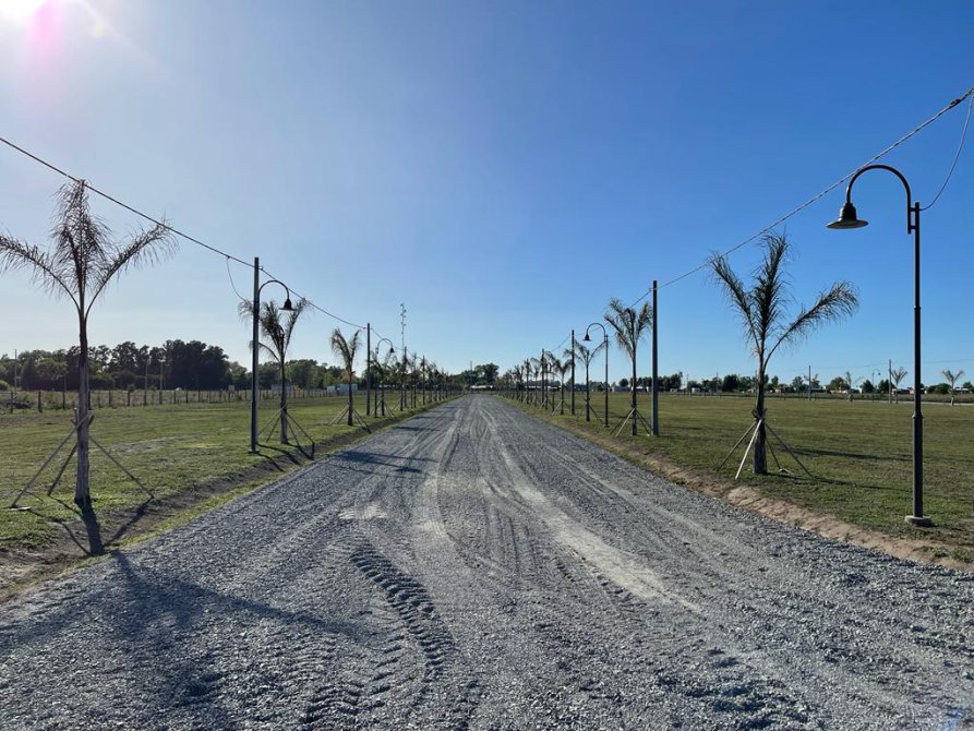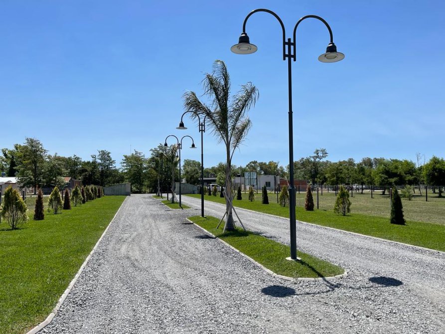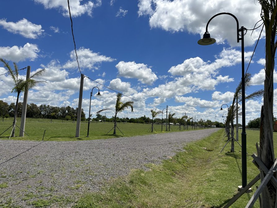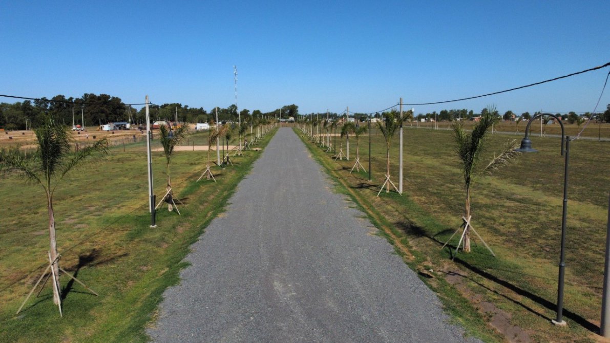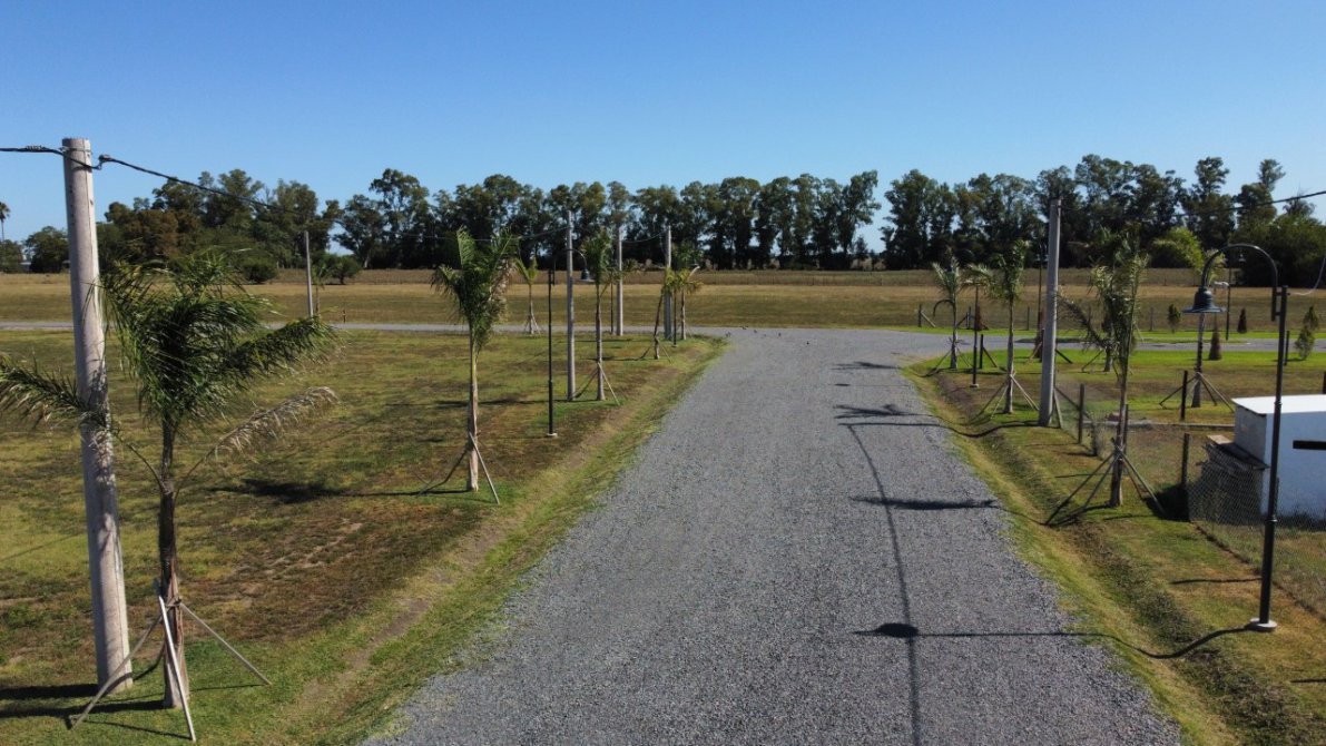 101 palmeras (de 4 a 6 mts de altura aprox) distribuidas en todos el predio y todos los servicios sobre cada frente (Luz, Agua, Gas).