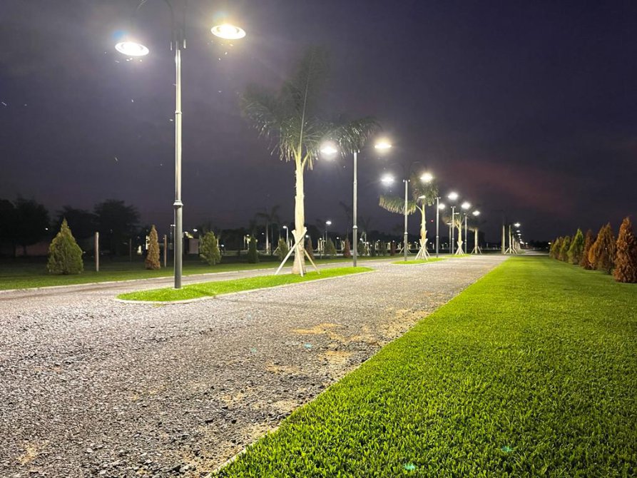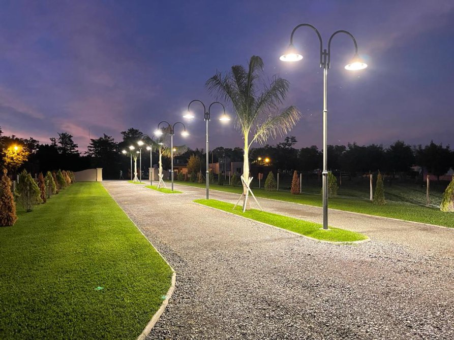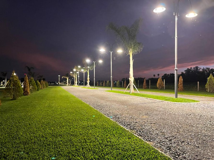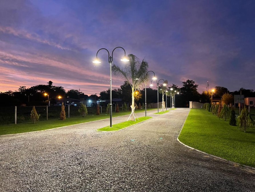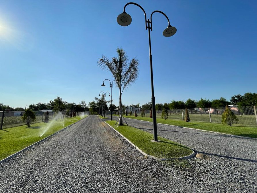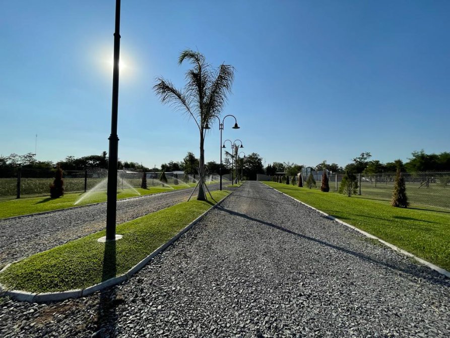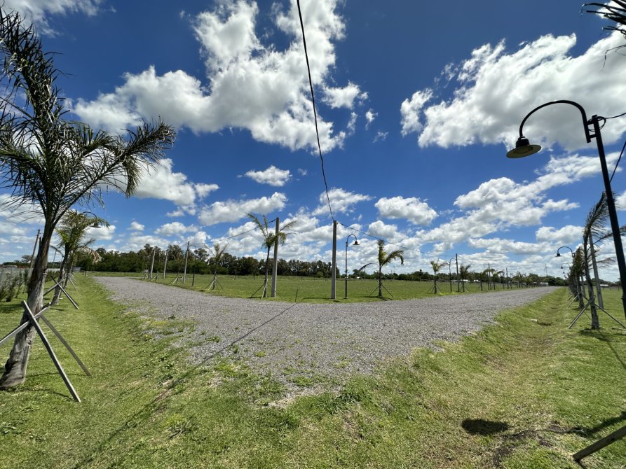 101 palmeras (de 4 a 6 mts de altura aprox) distribuidas en todos el predio y todos los servicios sobre cada frente (Luz, Agua, Gas).