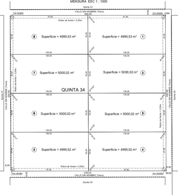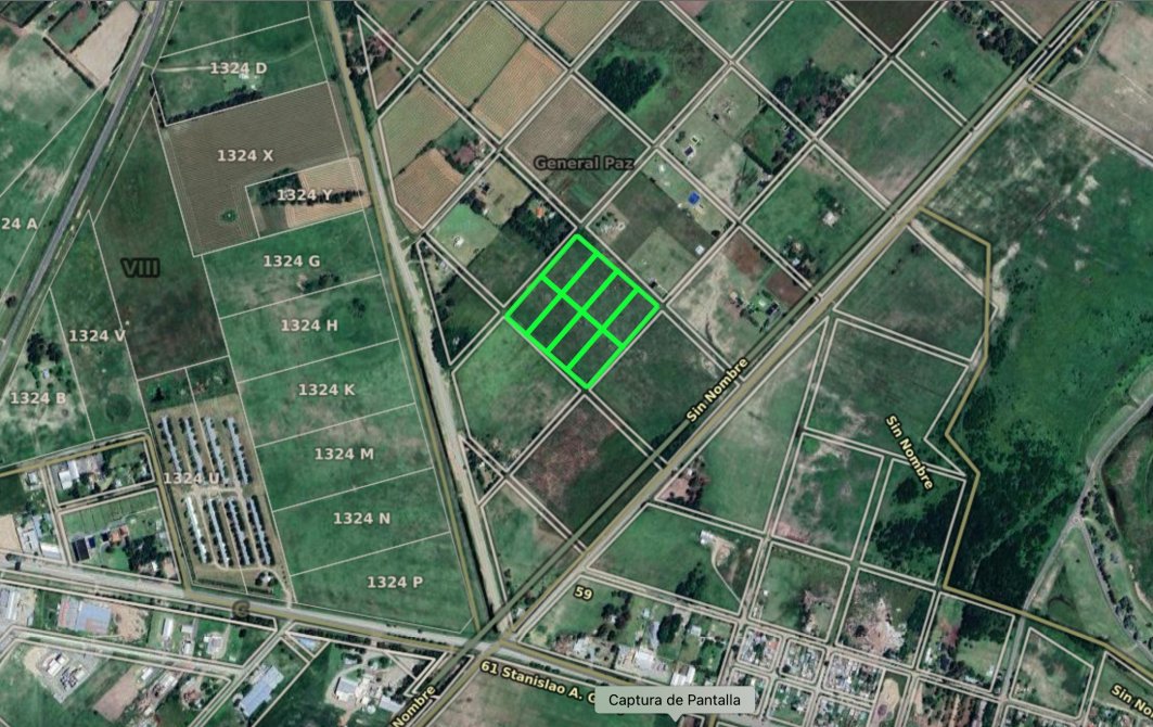 El loteo cuenta con 4 has Totales, la cual se divide en 8 lotes de 5000 M2 (1/2 Hectarea).