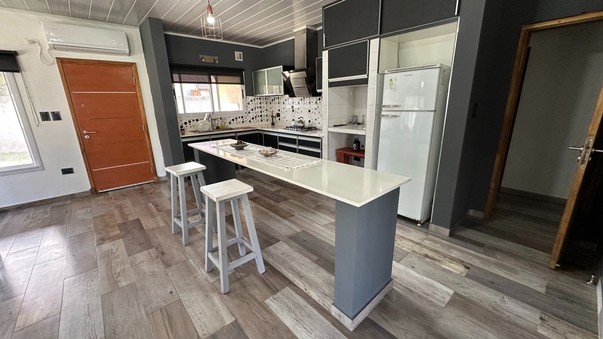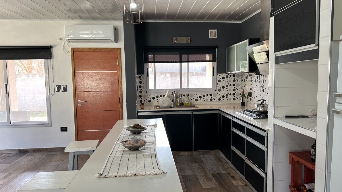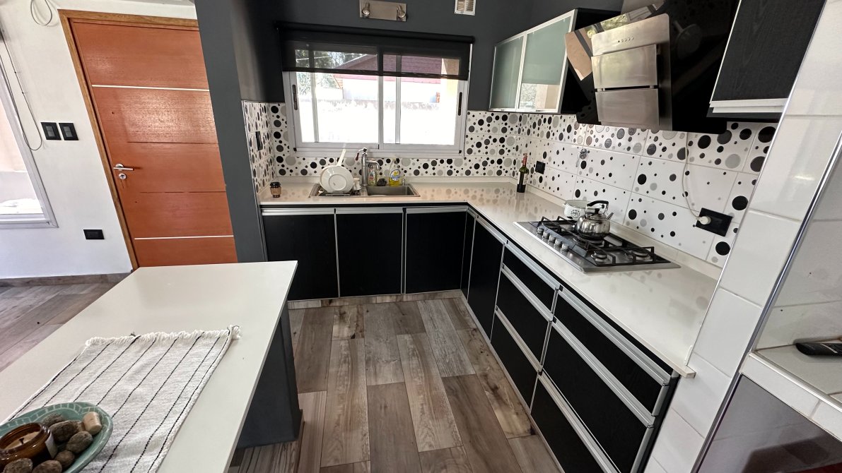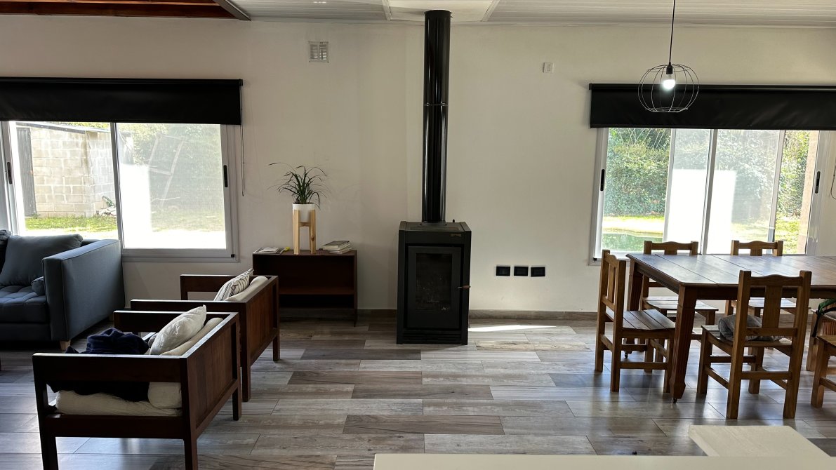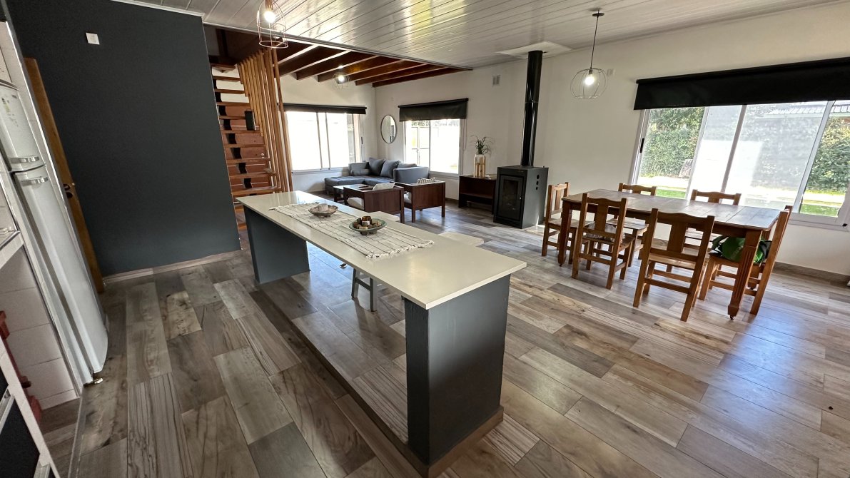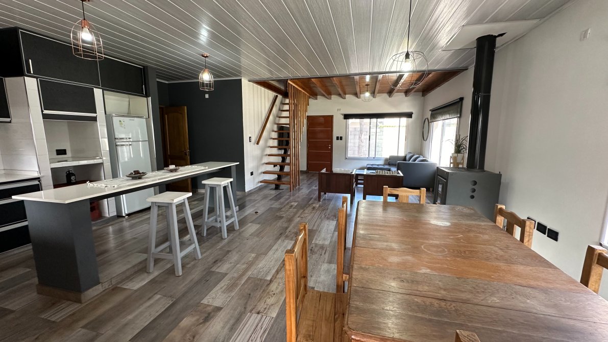 Al ingresar en planta baja, nos encontramos con un luminoso living-cocina- comedor con una isla desayunadora y estufa Tromen, dando vista la pileta de 7x4 con bordes atermicos, siguiendo en planta baja cuenta con un baño y 2 dormitorios (uno de ellos con baño en suite)