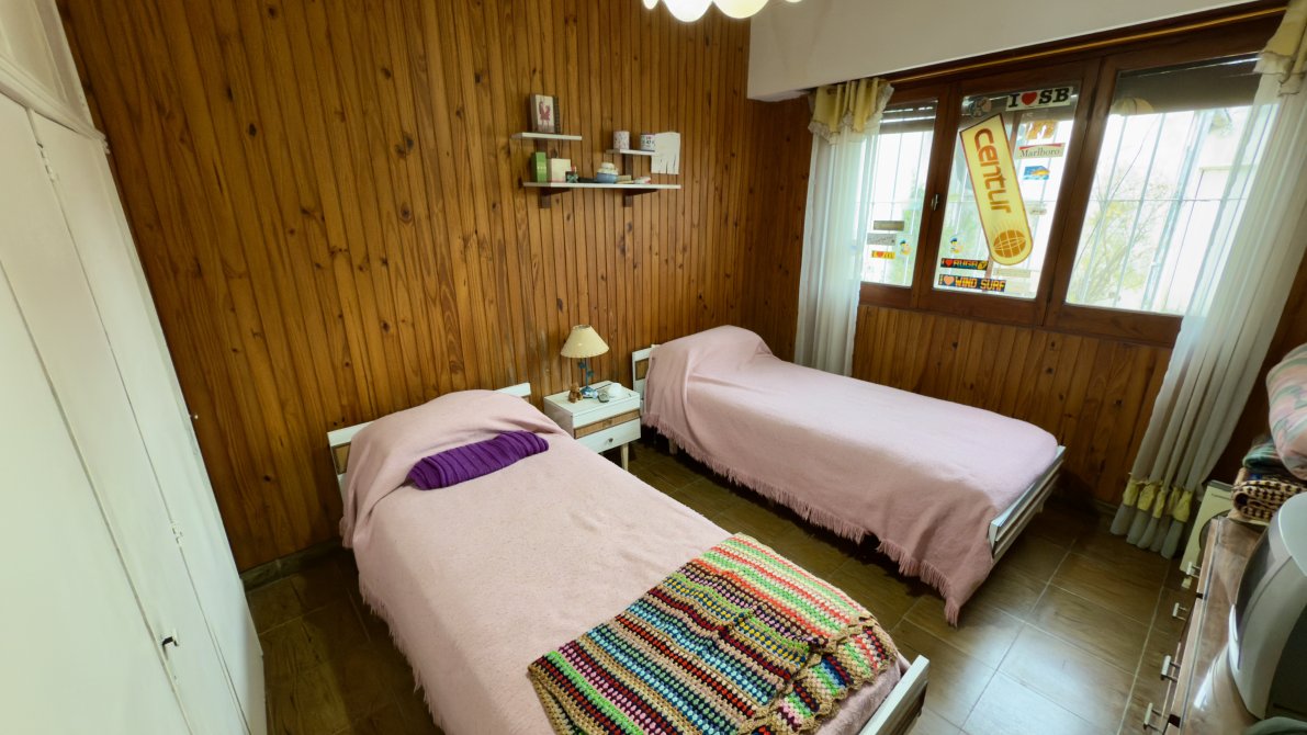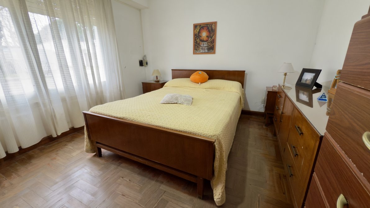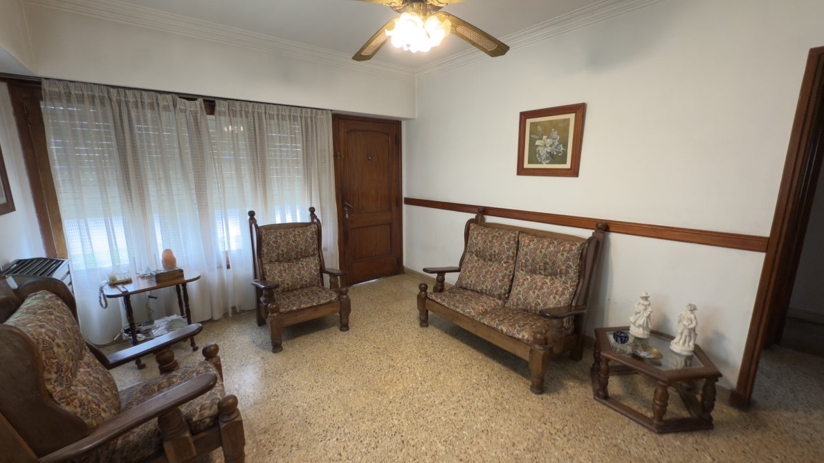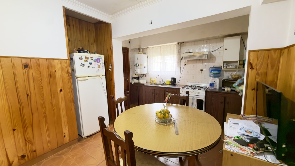 Al ingresar, nos recibe un living amplio con pisos de mosaico en buen estado. La cocina presenta una de sus paredes revestida en machimbre, con azulejos en la zona de trabajo, mesada de mármol y mueble bajo mesada, lo que la hace funcional y práctica para el uso diario. Desde allí, una puerta balcón comunica directamente con el garaje-quincho.