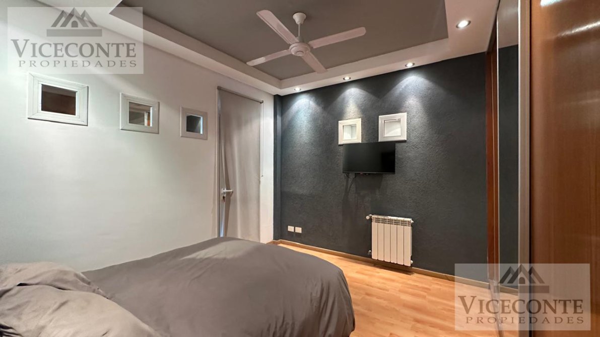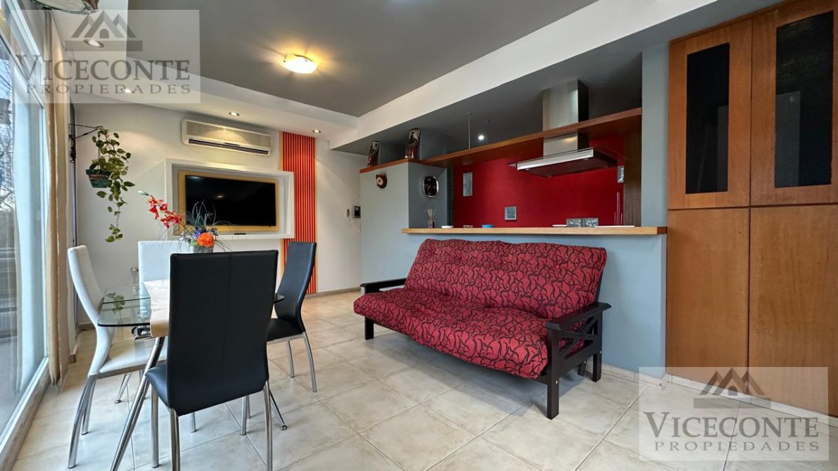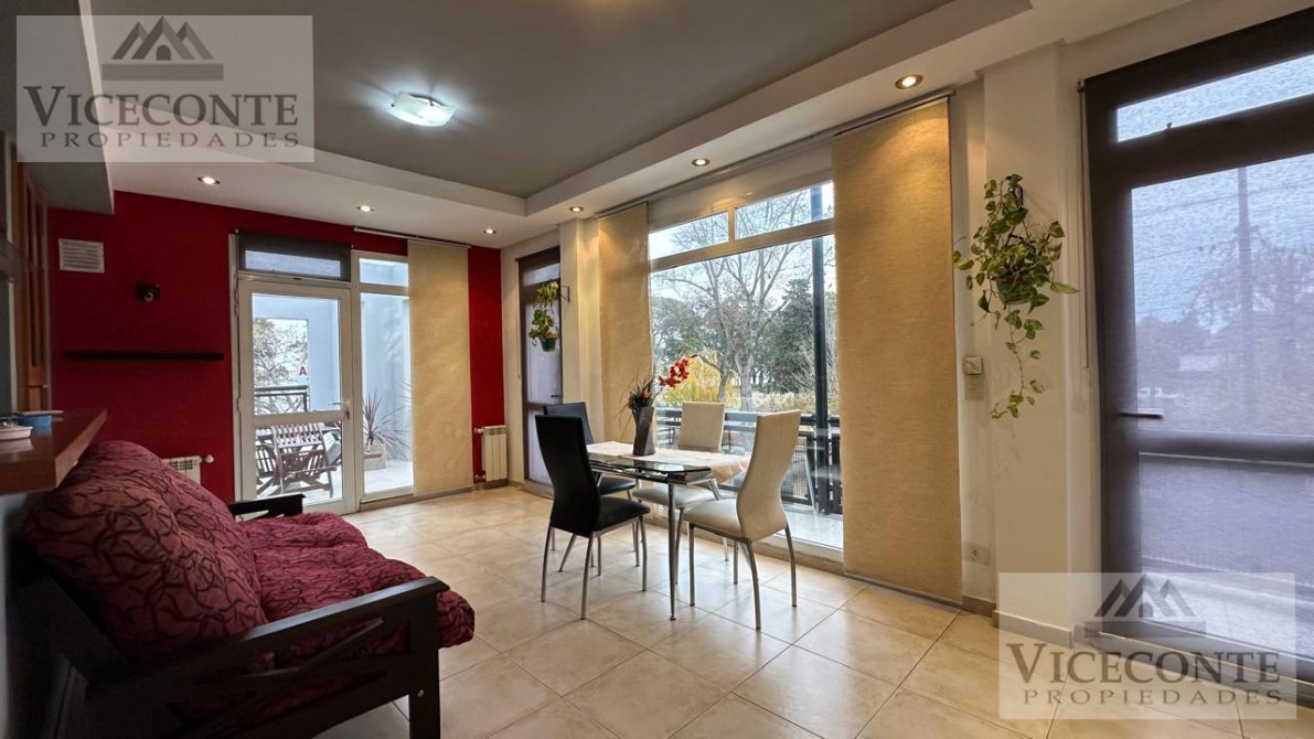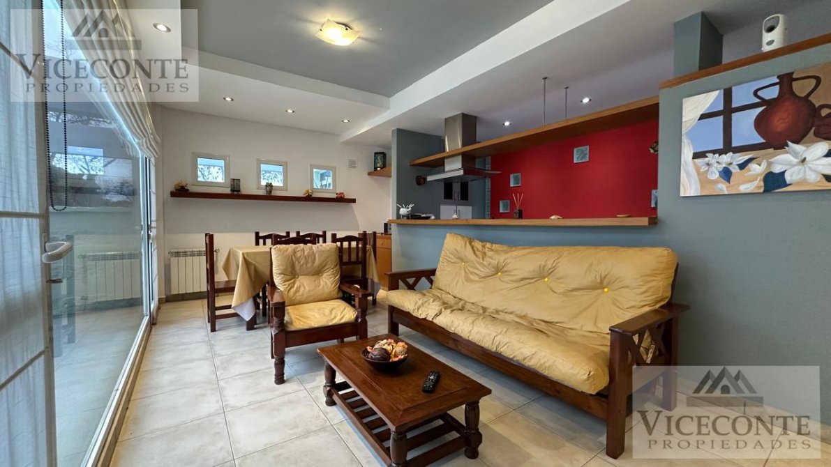 - Departamento 1: living comedor con ventanal a la terraza con calefacción por radiador de agua caliente (calefactor) y aire acondicionado frio calor (Alaska), con barra pasa plato a la cocina la que presenta mesada, bajo mesada y alacenas superiores, un depósito de lavarropa y caldera. 1 terraza de (3x10,50), 2 habitaciones con placar embutido, pisos flotantes y calefacción por radiador de agua caliente, una de ellas con ventanal hacia la terraza; 1 baño con ducha. pisos de cerámicos en todo el departamento a excepción de las habitaciones que presenta pisos flotantes, aberturas de DVH.