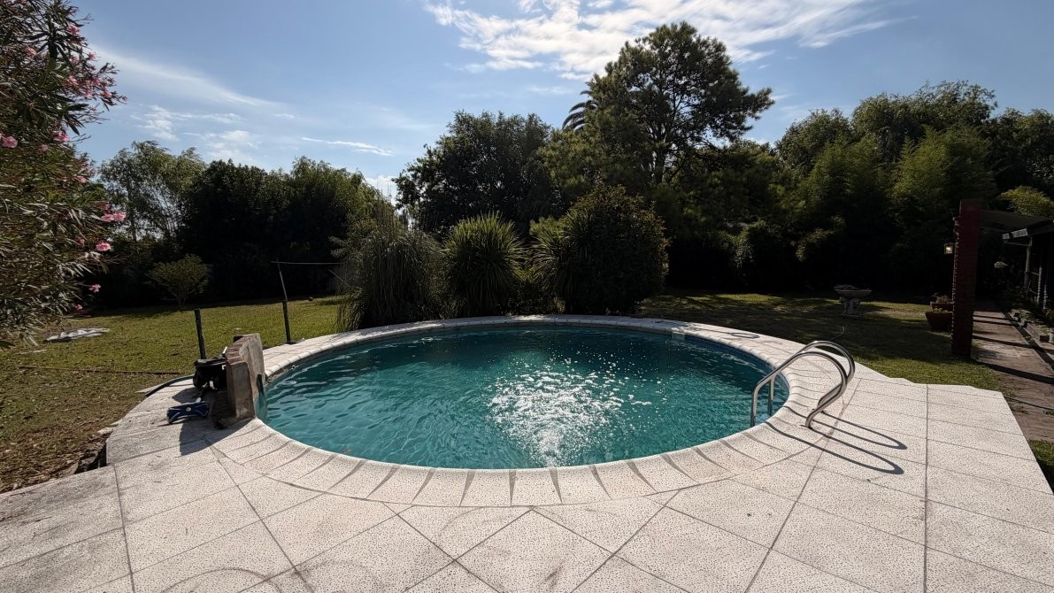 Piscina de 6,30 m de diámetro, con solado perimetral y espacio de guarda para reposeras.