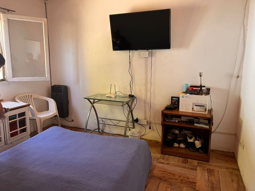 Monoambiente con divisor: cocina-living de un lado y dormitorio con baño y estufa de tiro balanceado del otro.